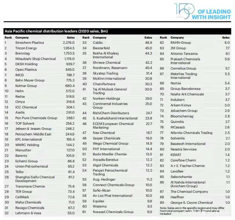 近日,ICIS安迅思发布亚洲化工分销商100强榜单。