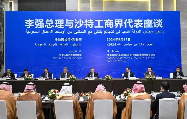 当地时间9月11日上午,国务院总理李强在利雅得同沙特工商界代表座谈交流。沙特投资大臣法利赫、商务大臣卡斯比以及包括沙特基础工业公司(SABIC)首席执行官阿卜杜拉哈曼·阿尔-法季在内的,来自沙特公共投资基金、沙特国家石油公司、沙特国际电力和水务公司、阿吉兰兄弟控股集团等企业负责人和中国-海合会共同投资联合会代表出席。