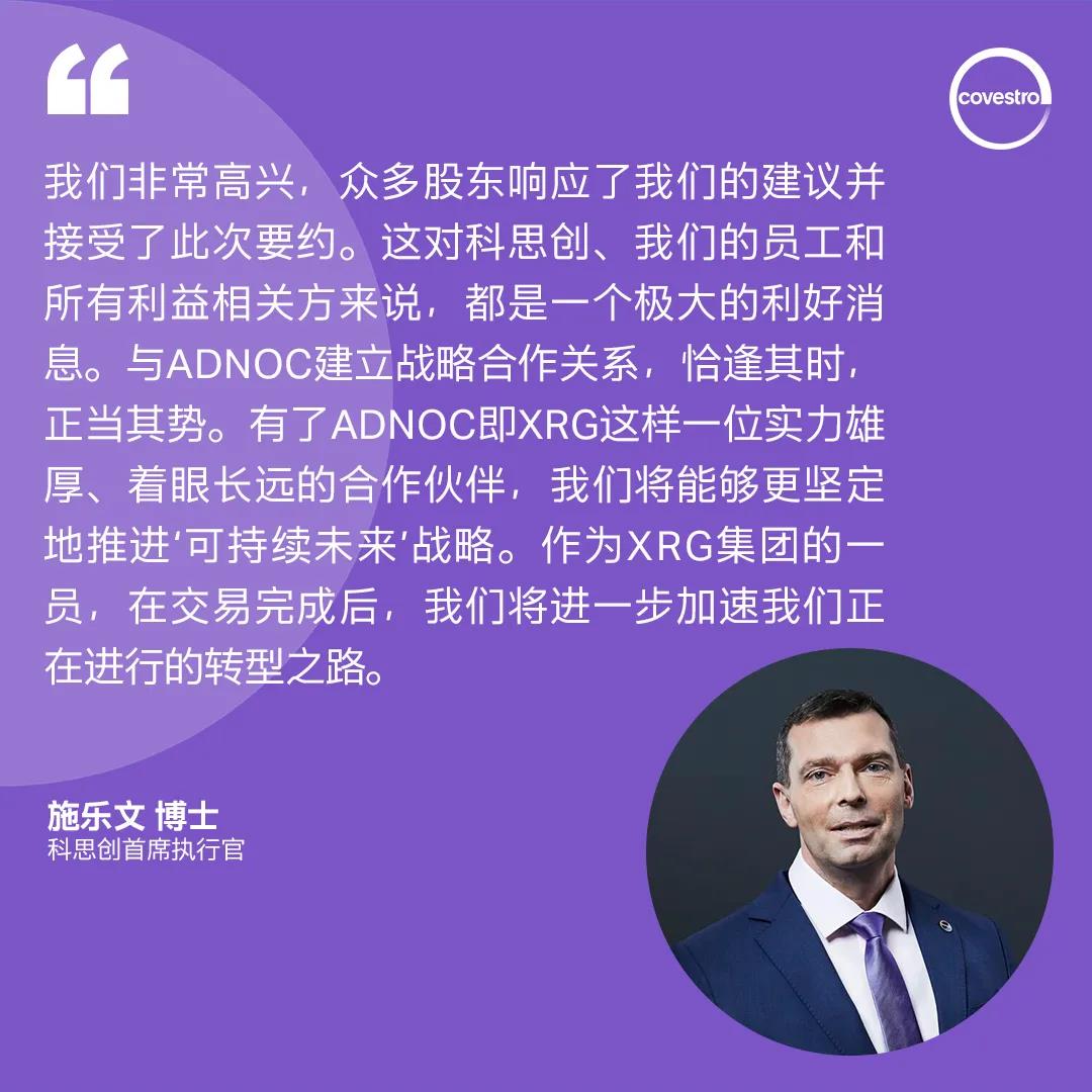 XRG将科思创视为其高性能材料与特殊化学品(Performance Materials and Specialty Chemicals)业务的基础平台,并对科思创的战略前景及其实现完全循环的愿景充满信心。收购科思创将成为XRG迈向全球前五大化工企业战略目标的关键里程碑。