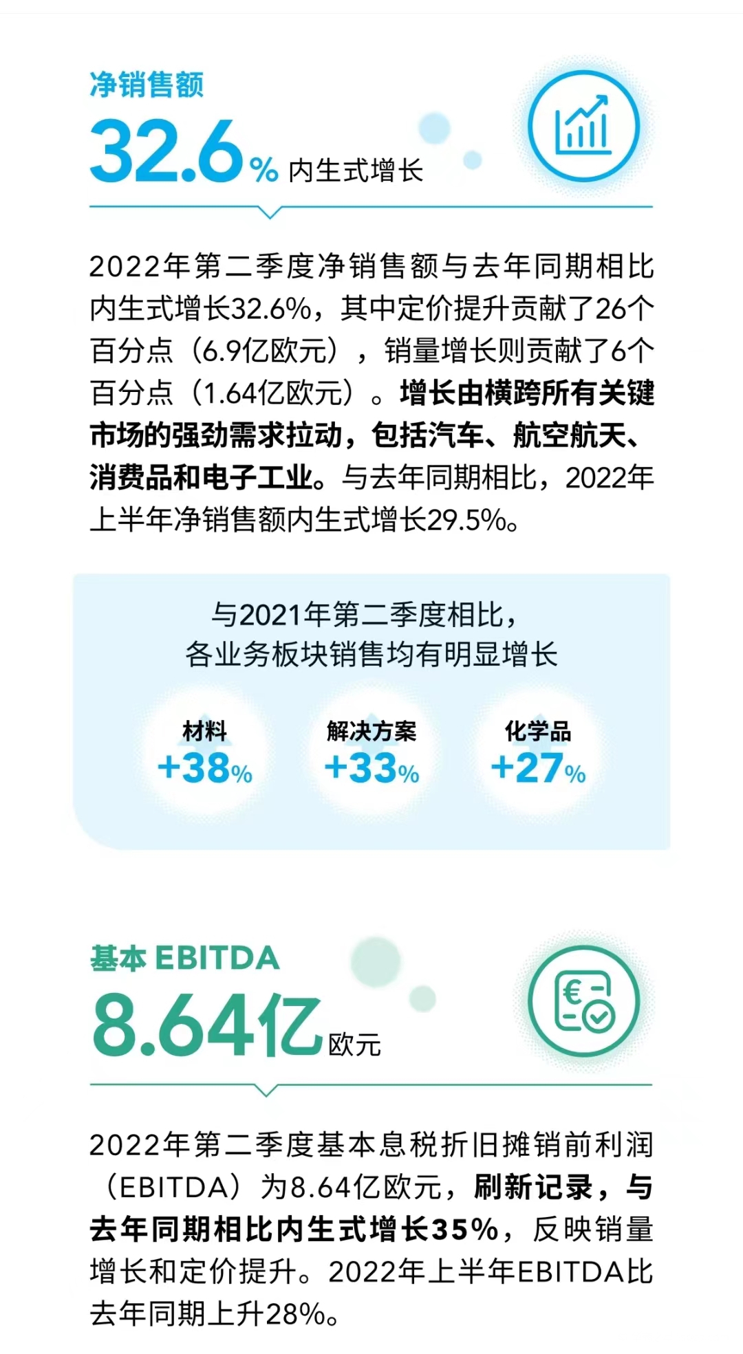 2022年第二季度基本息税折旧摊销前利润(EBITDA)为8.64亿欧元,刷新记录,与去年同期相比内生式增长 +35%,反映销量增长和定价提升。各业务板块的内生式EBITDA增长为: 解决方案+58%,材料+45%,化学品+18%。2022年上半年EBITDA比去年同期上升28%。