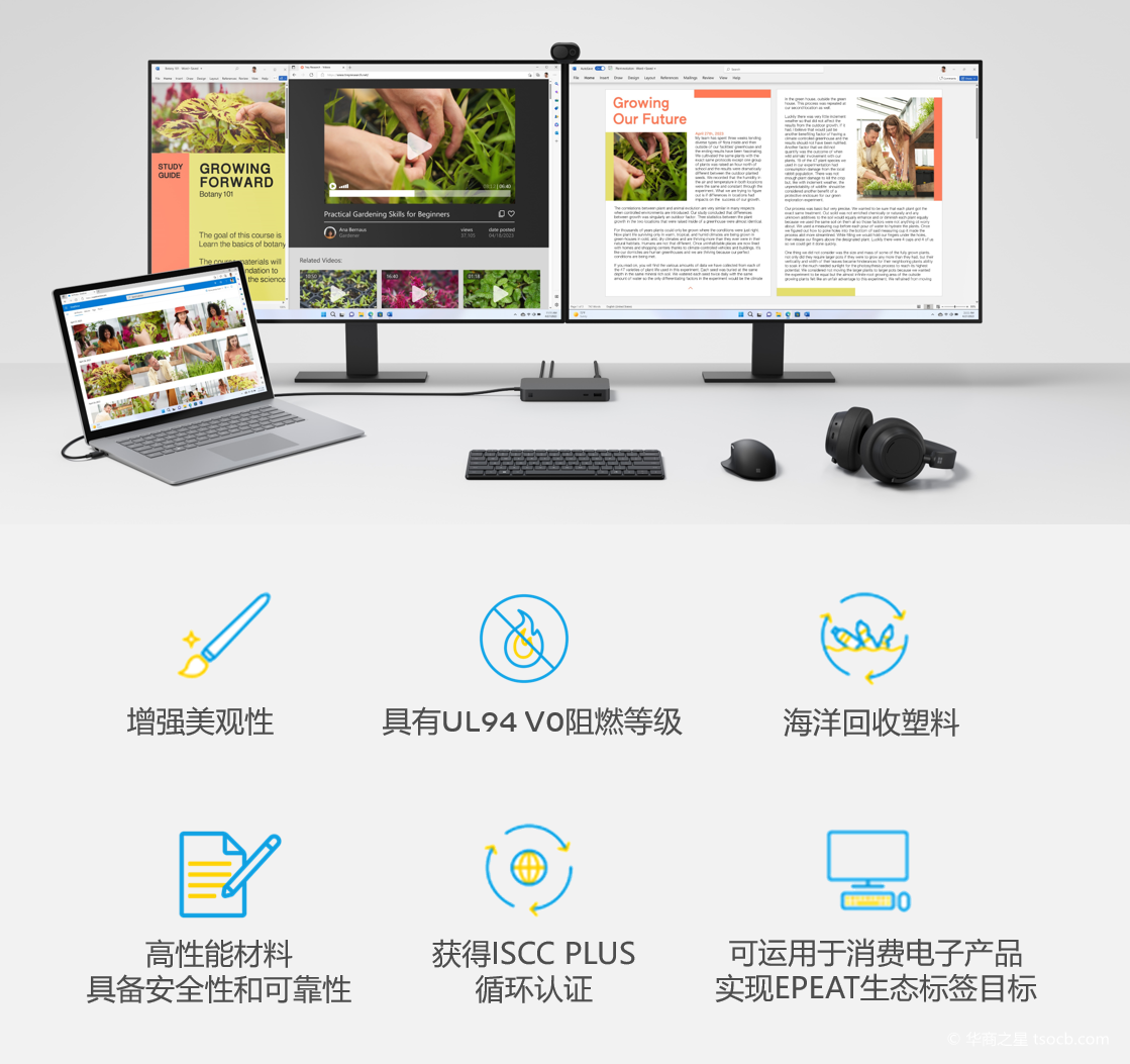 LEXAN阻燃聚碳酸酯材料在微软Surface Thunderbolt™4 Dock的成功应用,展示了利用先进的回收技术将海洋回收塑料用于消费电子产品的高性能材料的可行性。