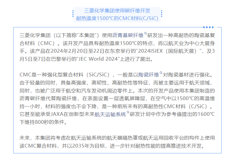 三菱化学集团使用碳纤维开发耐热温度1500℃的CMC材料(C/SiC)