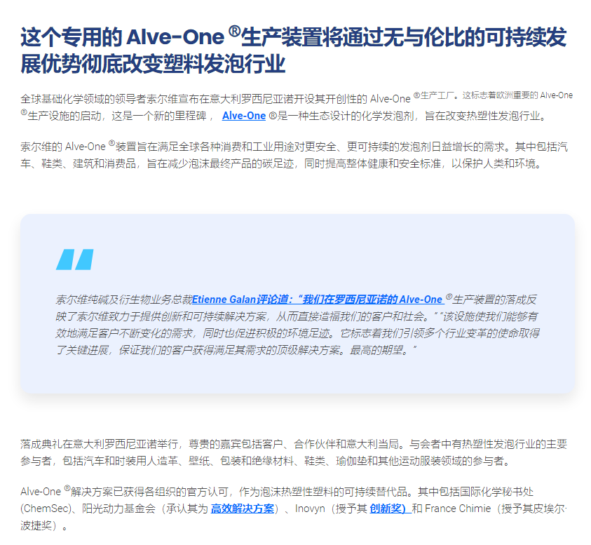 索尔维在意大利罗西尼亚诺开设新的发泡剂生产工厂